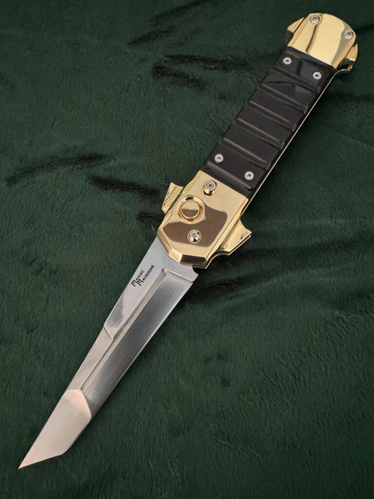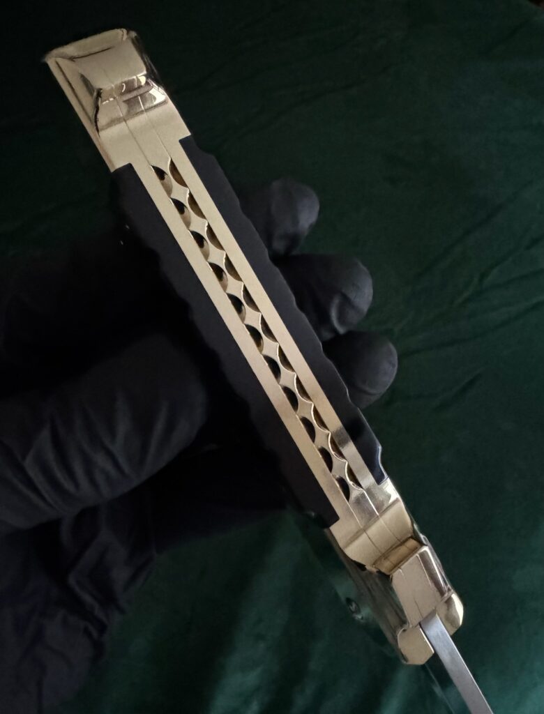 The Stinger Edc features – 360 billet brass frame. fully machined and hand finished. .156 440-c stainless steel blade, hand ground and finished. safety switch. .437 mega torque coil spring. tube packaging, & felt bag. $700. (picture for reference, new picture of brass model coming soon.