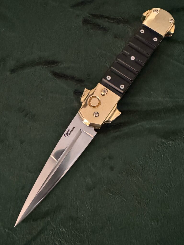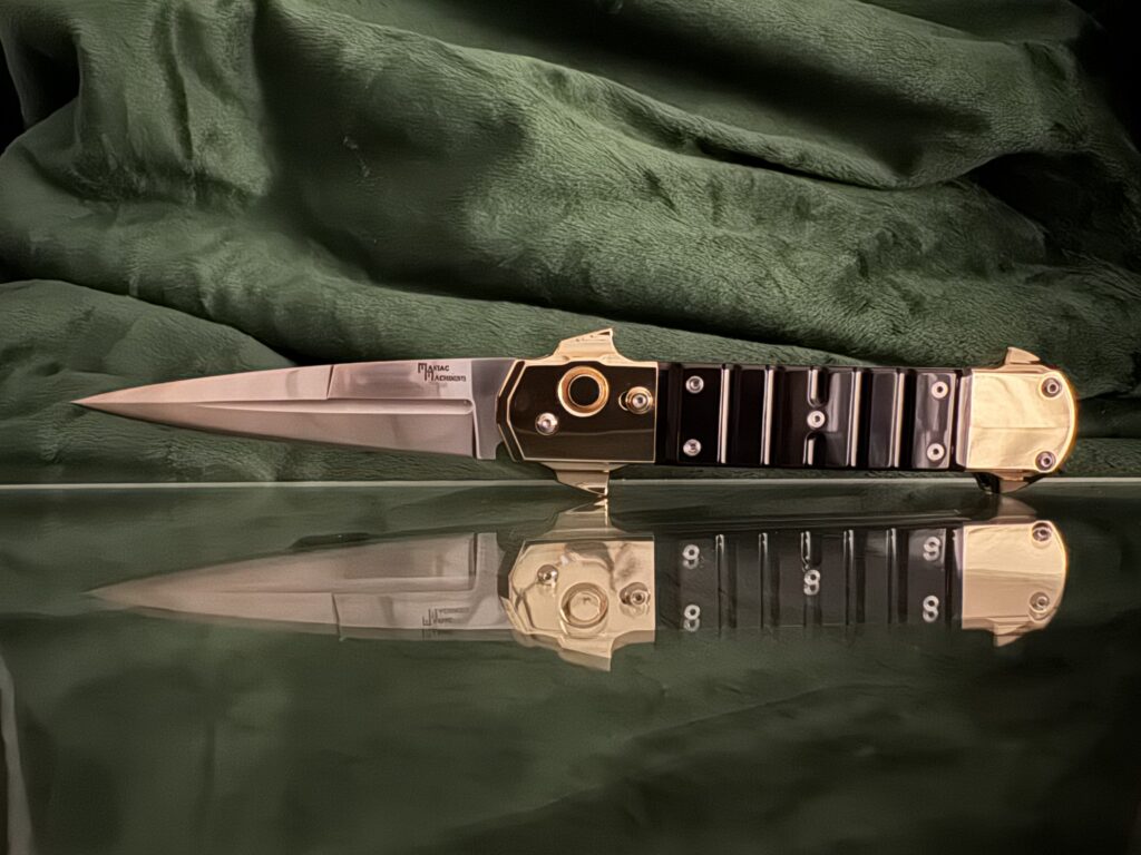 The maniac stinger – it even has a safety, somthing ive always wanted to put on my conversion knives back in the day. the stinger is a beautifully built hand-made automatic. this one is garunteed to last over 100 years!