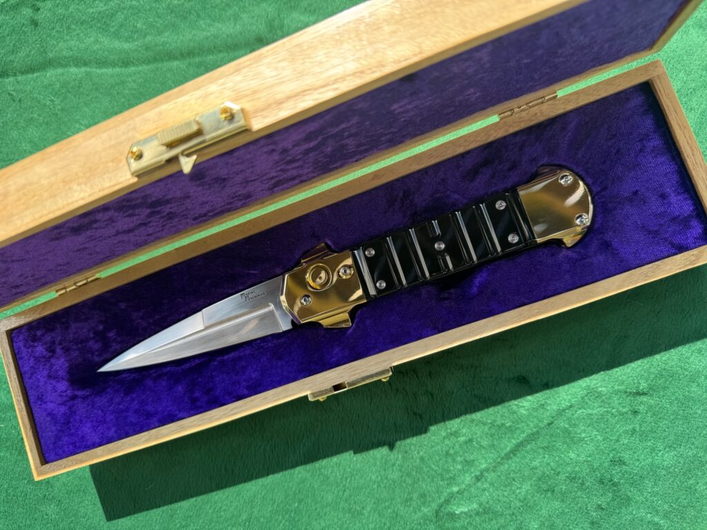 The Stinger Custom Features – 360 billet brass frame. fully machined and hand finished. .156 440-c stainless steel blade, hand ground and finished. exotic scales. mill/file work on spine. .437 mega torque coil spring. safety switch. hand made velvet lined wood presentation box. $1,300.