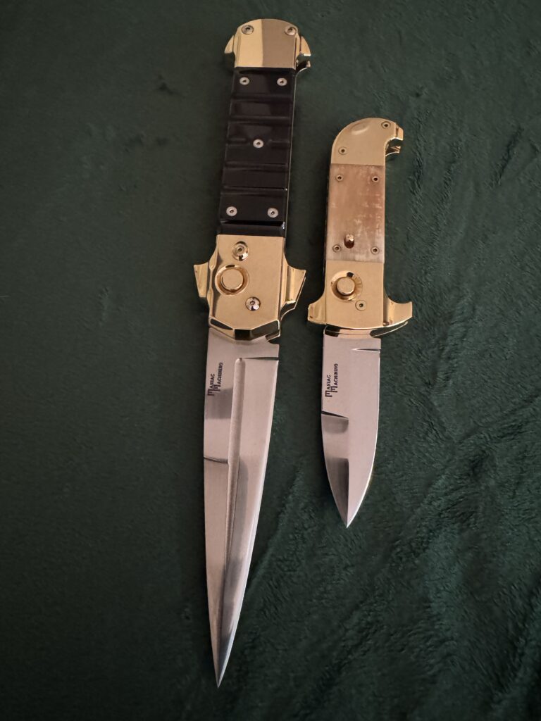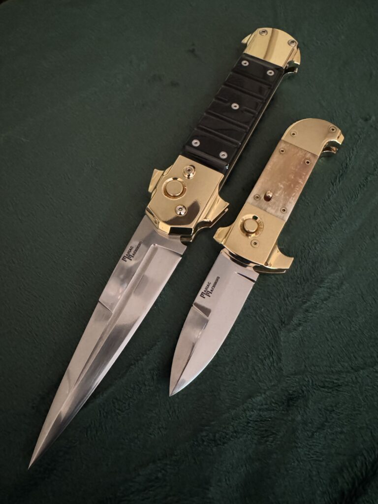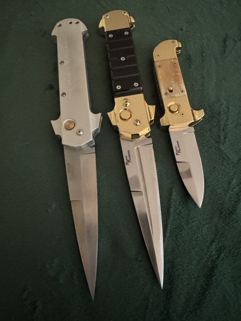 my father was an over-the-top gun and knife enthusiast. i guess you could say i was born with a knife in one hand and a gun in the other. i was walking the gun and knife show floors as soon as i learned to walk. i have always been fascinated with knives. especially switchblades. they are so much cooler than a fixed blade or pocket knife because they actually do something with the touch of a button! how cool is that?!